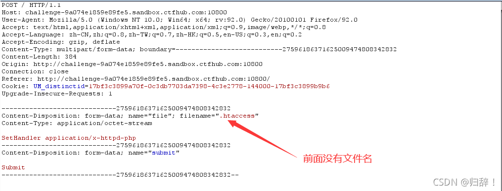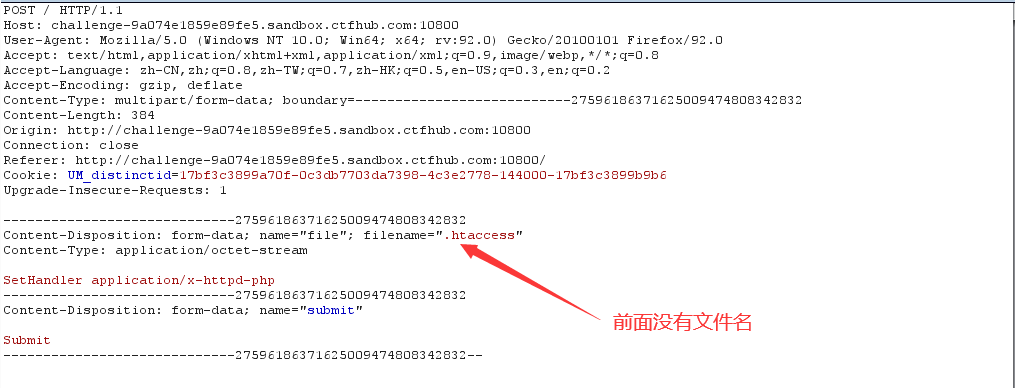 3、尝试使用.htaccess文件绕过,上传一个.htaccess文件,文件内容如下: