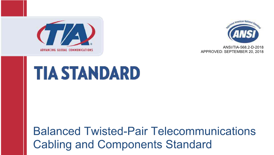 平衡双绞线电缆系统的最新TIA标准—TIA 568.2-D—于2018年6月12日TR-42.7会议期间批准发布,预计该标准将在不久的将来取代TIA-568-C.2。