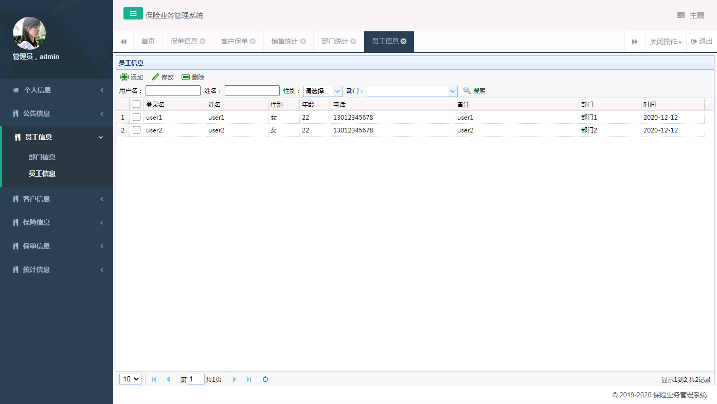 模块划分:部门模块、员工模块、公告类型模块、公告模块、客户类型模块、客户模块、保险模块、保单模块、统计模块