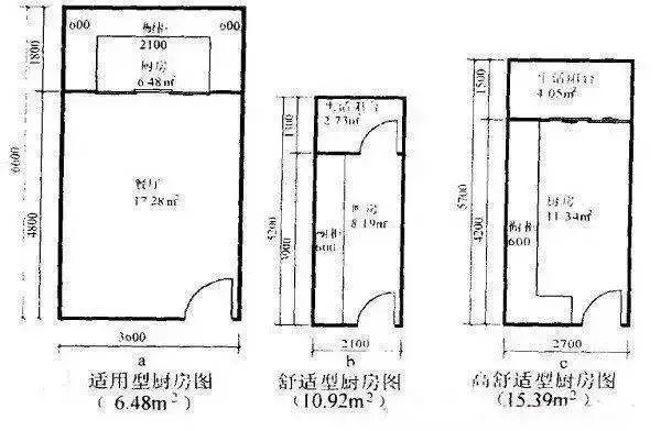 厨房是住宅非常重要的房间,它与套型舒适度关系极为密切。随着户建筑面积的增大,它的尺寸也随之加大。厨房的“适用”、“舒适”、“高舒适”尺寸大致如图a、 b、 c所示。“高舒适“型厨房”对于时尚家庭,若用作西餐厨房,可兼作家人小餐厅。