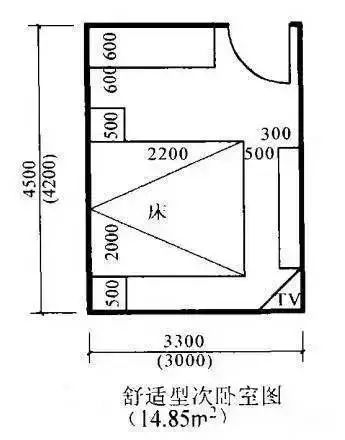 次卧室为住户非主人使用的卧室,它的最低“适用”开间尺寸是3. 3m(净3.0m) ,进深尺寸是4. 5m(净4.2m)。
