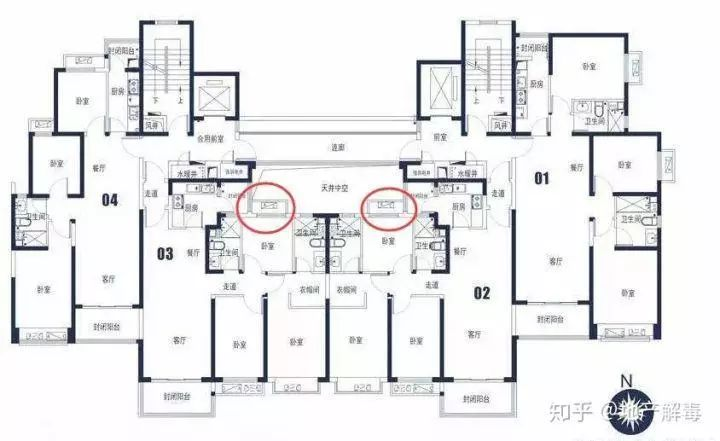 说实话,看到这种户型我是很崩溃的。这种户型是为了南北通透而南北通透。看起来,中间户的北侧是可以开窗,但实际的公摊变大,而且大到购房人足以血亏的程度。