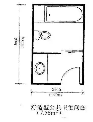 公共卫生间以矩形为佳,因这样既可少占面宽又可将洗漱与浴厕隔开,使之可供一人洗漱一人浴厕同时使用,增加它的使用功能,使户型更加“适用”或“舒适”,具体如图所示。