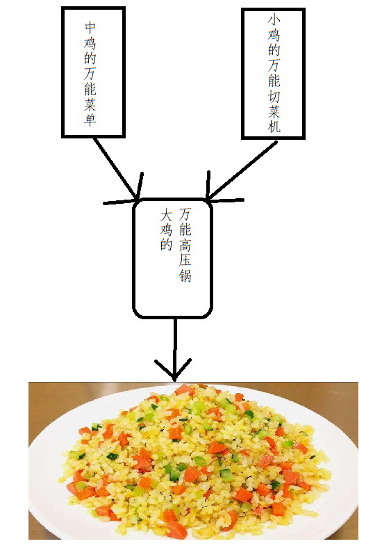 | 经过前几次的做饭,你费尽了脑筋,所以你不得不动动脑子。你想到了你的好朋友小鸡、中鸡、大鸡,小鸡那里有一个产菜法宝,你只需要告诉他菜的名字他便会切好送给你,中鸡那里有一个万能菜单,你只需要将菜名给他他便会给你一些列的做菜教程。大鸡那里有一个万能锅,你只需要将做菜教程跟菜品放锅里面,不久就会有香喷喷的菜出锅。于是你站在你三个朋友的肩膀上发明了万能厨房(只需要报菜名、烹饪方式、火候)就会产出相应的菜。从此以后你的午饭再也不愁了。你的三个好朋友小鸡、中鸡、大鸡的法宝就可以看成一个个对象,而你面向这些对象根据他们的耦合关系进行组合得到了一个万能厨房系统。 |