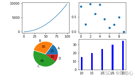 例如:ax1 = fig.add_subplot(221) , ax2 = fig.add_subplot(222) , ax4 = fig.add_subplot(224)就是在2*2个区域中,在左上,右上和右下建立子图: