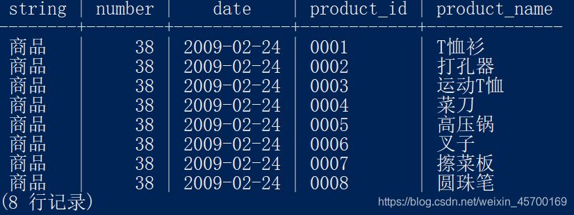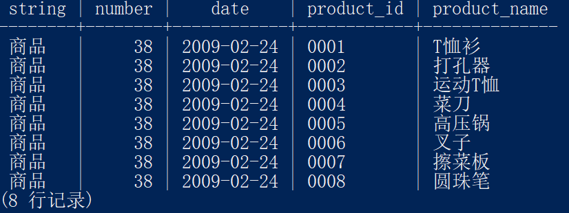 SELECT '商品' AS string,38 AS number,'2009-02-24' AS date,product_id,product_nameFROM Product;