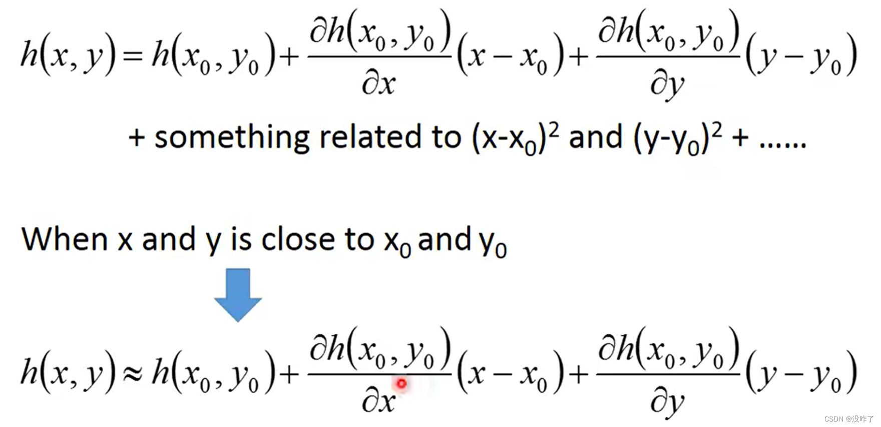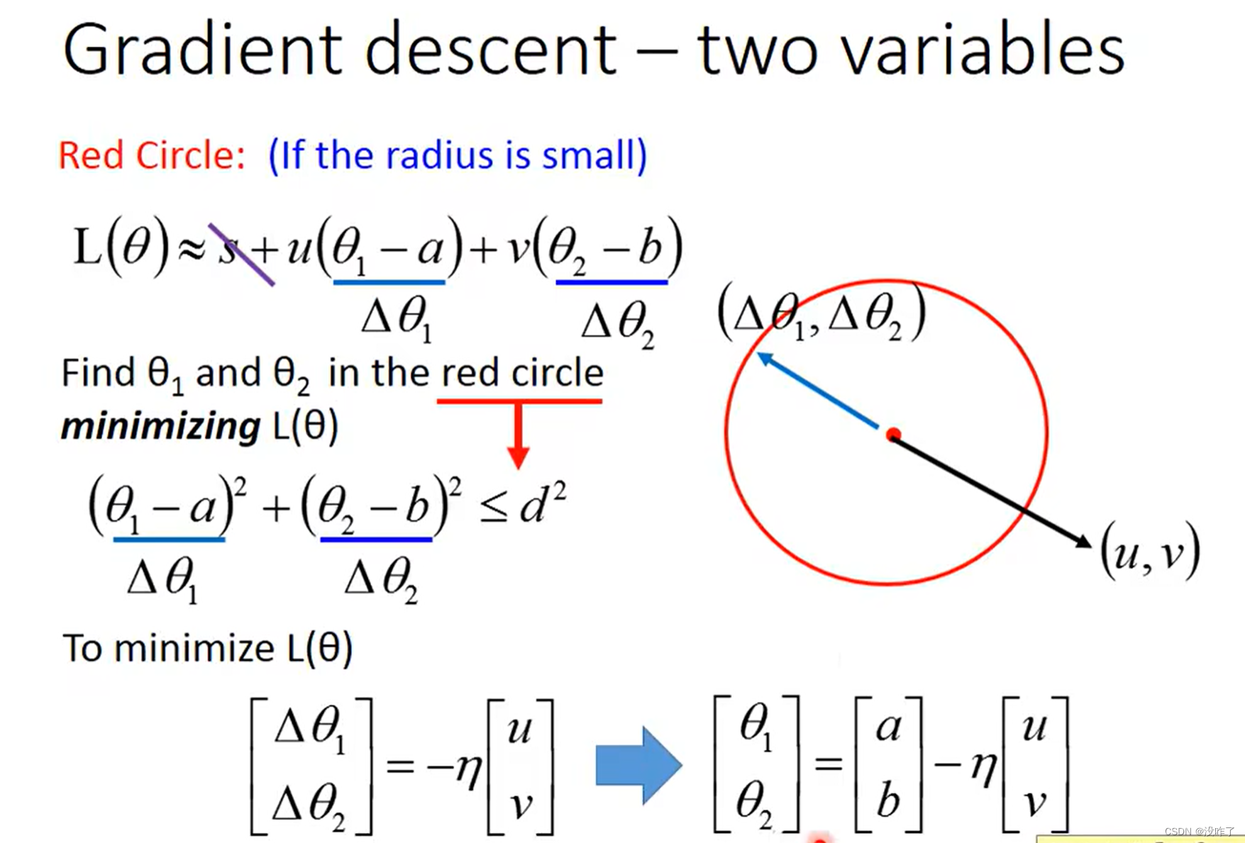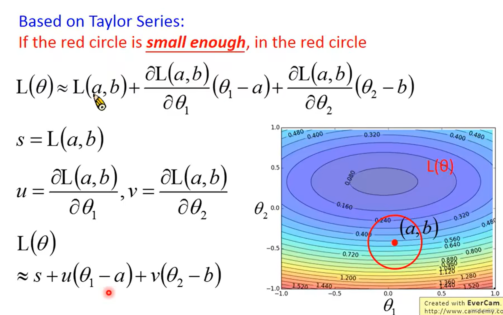如何快速在圆圈内找到最小值。基于泰勒展开式,在 (a,b)(a,b) 点的红色圆圈范围内,可以将损失函数用泰勒展开式进行简化: