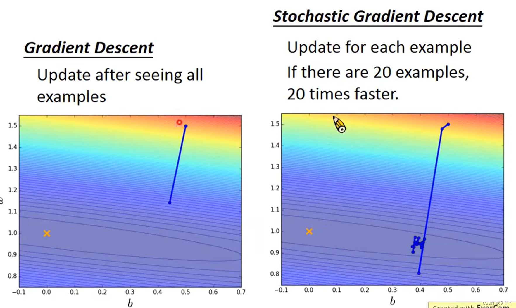 常规梯度下降法走一步要处理到所有二十个例子,但随机算法此时已经走了二十步(每处理一个例子就更新)