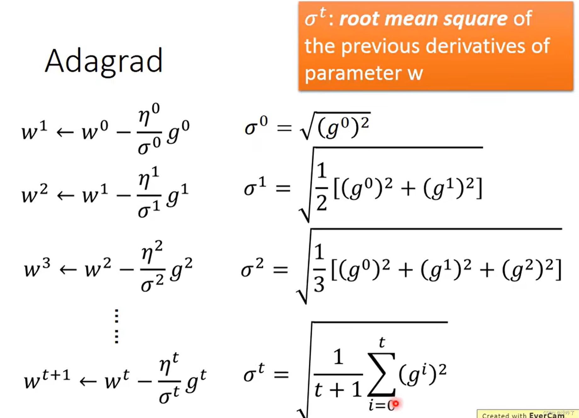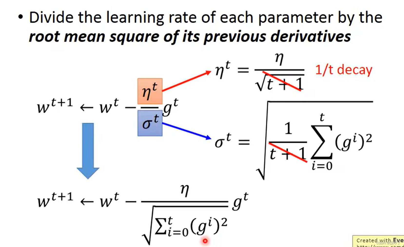 Adagrad:每个参数的学习率都除上之前微分的均方根。