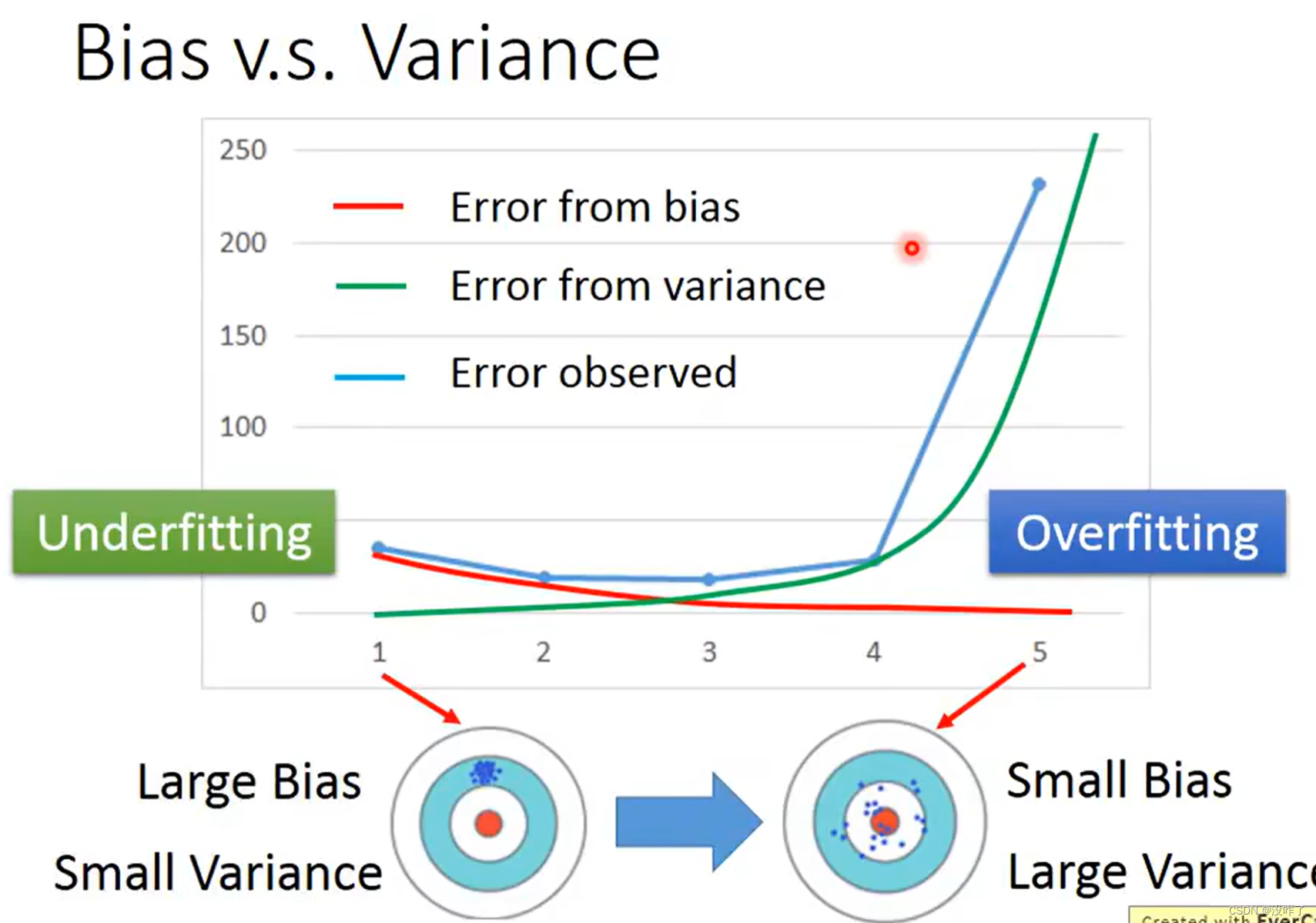 Average\ Error随着模型复杂增加呈指数上升趋势。更复杂的模型并不能给测试集带来更好的效果,而这些 Error的主要有两个来源,分别是 bias(偏差)和 variance(方差)。
