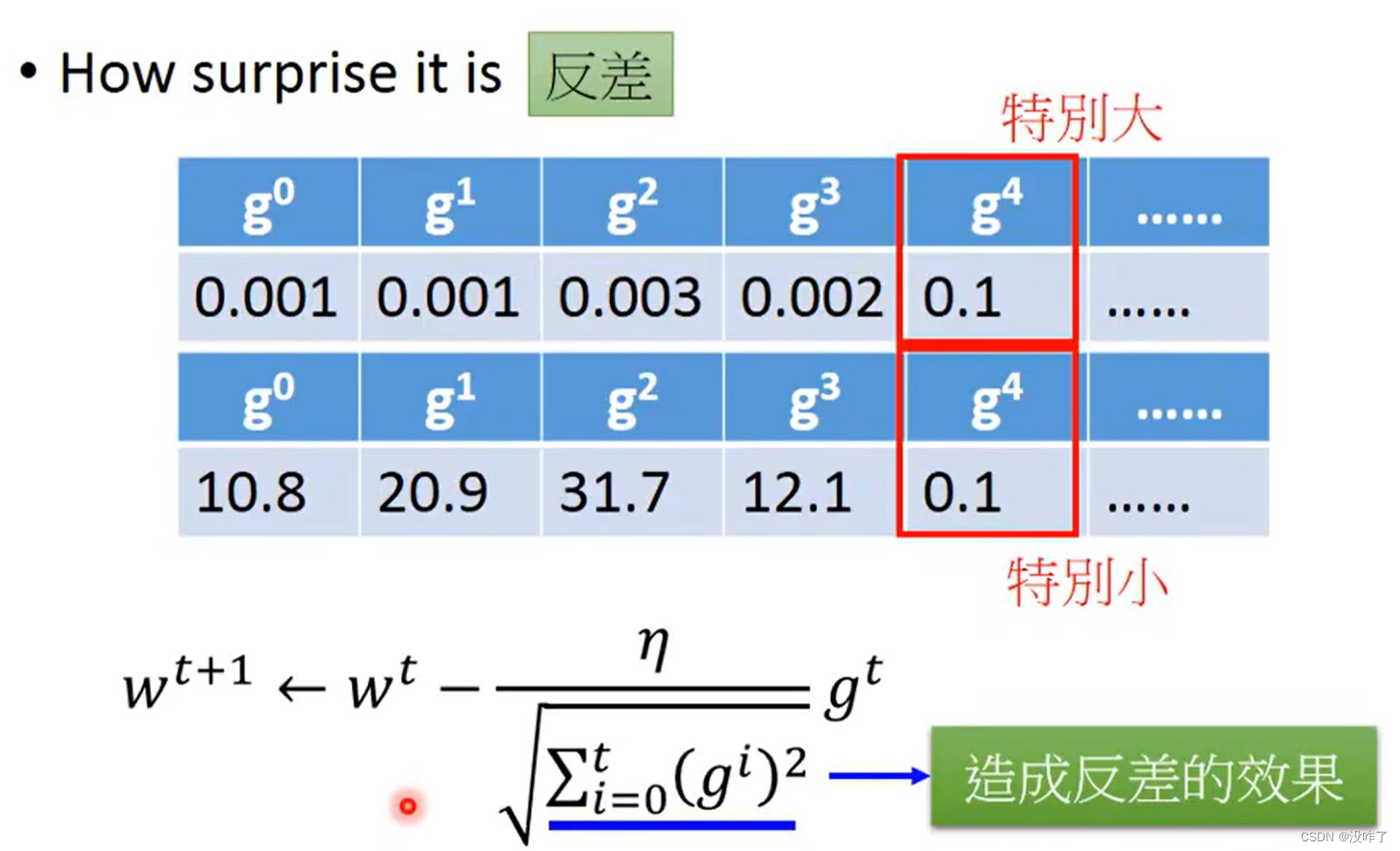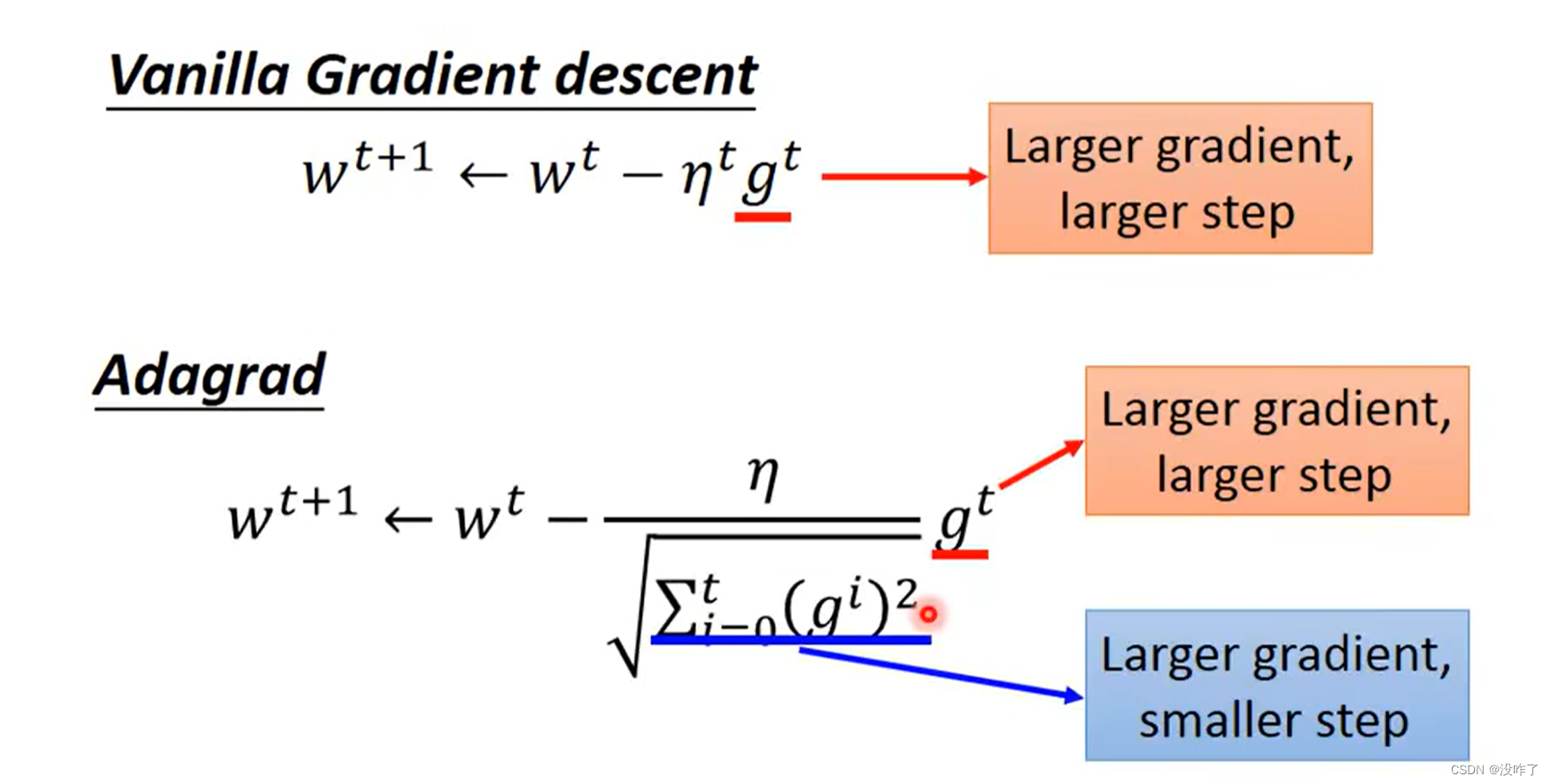 在 Adagrad 中,当梯度越大的时候,步伐应该越大,但下面分母又导致当梯度越大的时候,步伐会越小。