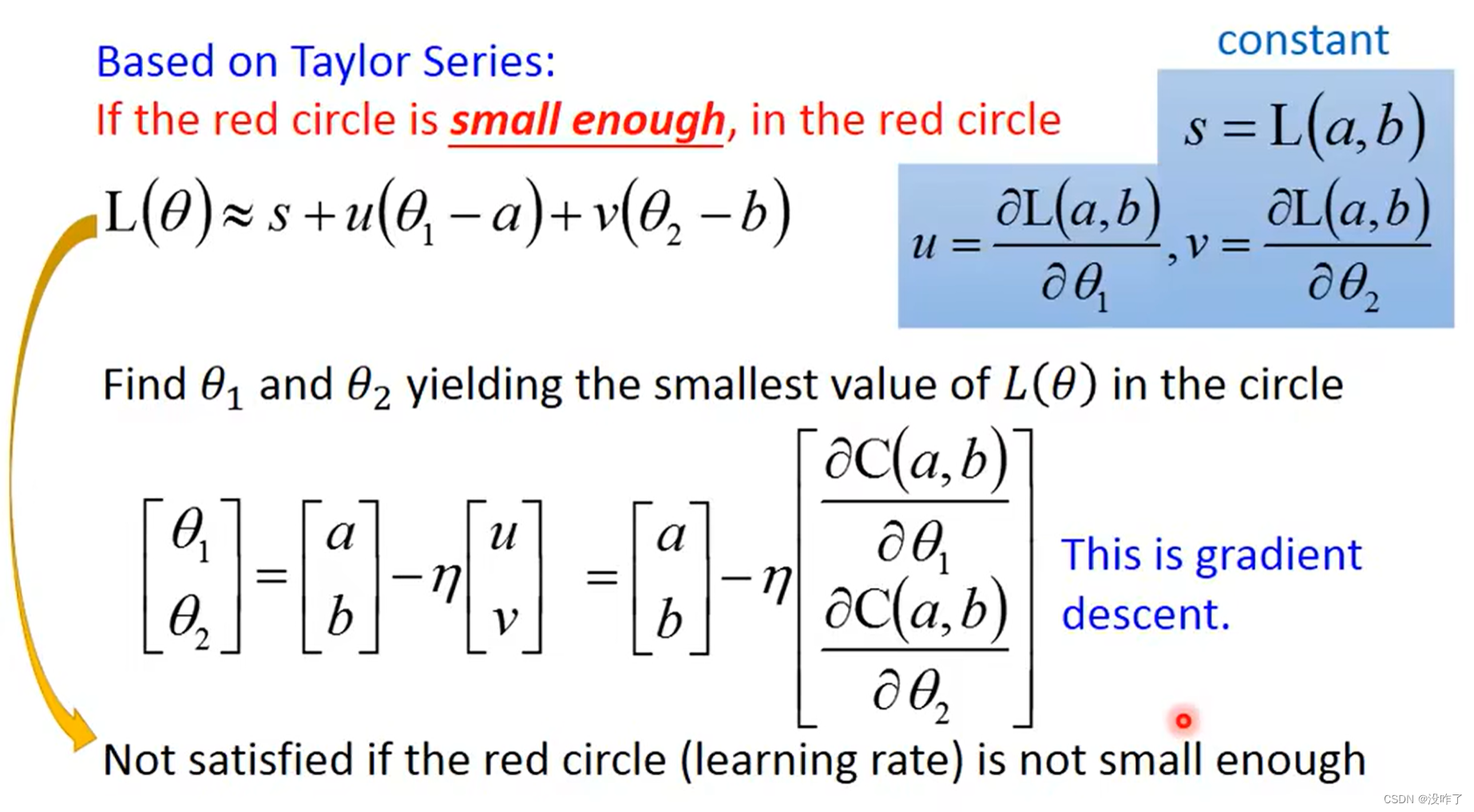 最后的式子就是梯度下降的式子。但这里用这种方法找到这个式子有个前提,泰勒展开式给的损失函数的估算值是要足够精确的,而这需要红色的圈圈足够小(也就是学习率足够小)来保证。所以理论上每次更新参数都想要损失函数减小的话,就需要学习率足够足够小才可以。