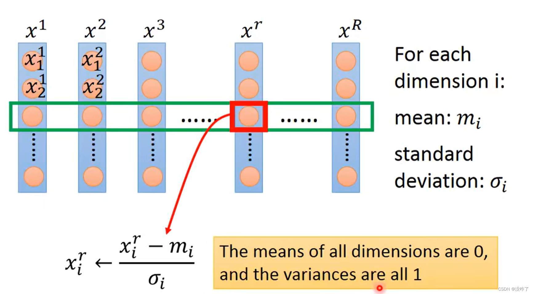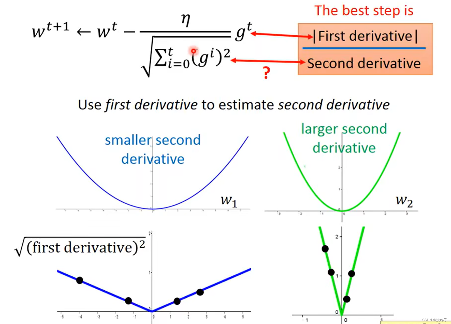 对于左边的情况,上面讲过这种狭长的情形不过不用Adagrad的话是比较难处理的,两个方向上需要不同的学习率,同一组学习率会搞不定它。而右边情形更新参数就会变得比较容易。左边的梯度下降并不是向着最低点方向走的,而是顺着等高线切线法线方向走的。但绿色就可以向着圆心(最低点)走,这样做参数更新也是比较有效率。