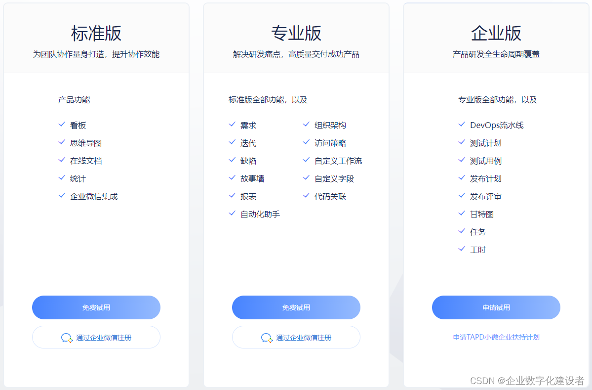 3.3 企业版:799/账号/年,试用期限为90天。小微扶持计划上线是30人。包括需求、发布计划、迭代、任务、测试计划、测试用例、缺陷、故事墙、甘特图、报表、文档等十余个核心应用以及支持工时填写和跟踪的工时进度。适合大中型研发团队的全过程、全方位的敏捷研发管理解决方案