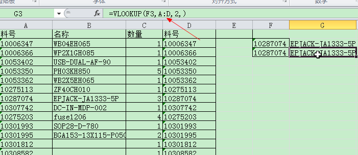 例如: =VLOOKUP(F1,A:D,2,FALSE)