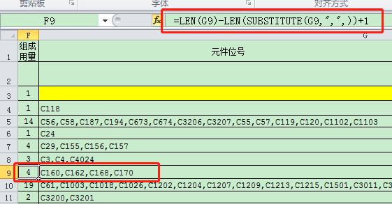 1、SUBSTITUTE函数,罗列物料位号的个数