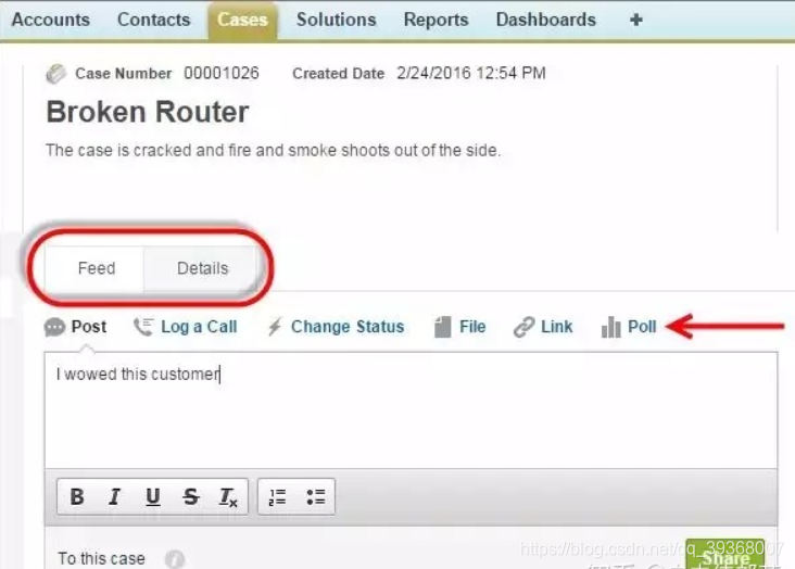 3 .这是一个Case的样式。看看Case feed发布者,你可以点击他们来做不同的事情。