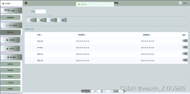 (3)系统公告:管理员点击“系统公告”菜单可以查看到系统中的所有系统公告信息,对已经存在的系统公告,管理员可以修改,也可以添加新的系统公告或者删除系统公告。