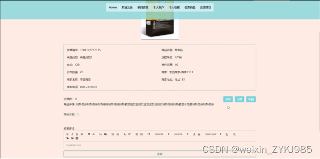 用户可以查看优惠商品,在查询到自己想要了解的优惠商品的时候,可以进入查看详细的介绍,点击“领取”这一按钮以后会跳转到领取信息填写的界面,根据提示填写好领取的信息,点击“提交”以后领取就完成了,在优惠商品详情这个界面,同时支持用户对喜欢的优惠商品进行收藏、点赞的功能,优惠商品详情展示页面如图4-6所示。