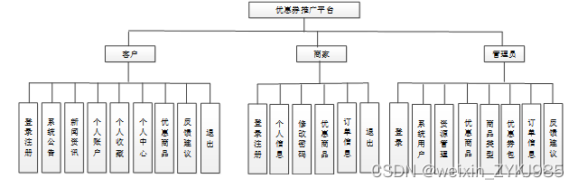 优惠券推广平台我划分为了管理员模块、商家模块以及客户模块这三大部分。