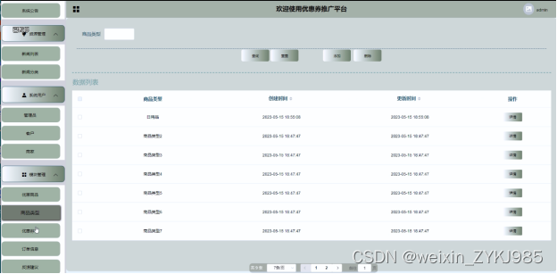 (6)模块管理:在“模块管理”这一菜单下,我们会看到优惠商品、商品类型、优惠劵包、订单信息、反馈建议,管理员可以对其进行增删改查操作。