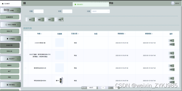 (4)资源管理:管理员点击“资源管理”菜单能够对其下子菜单新闻列表和新闻的分类进行增删改查。