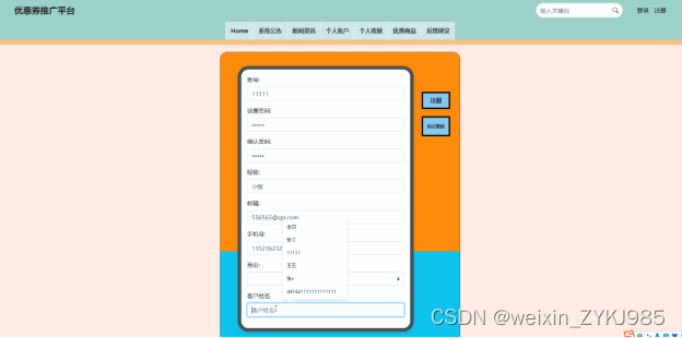 (1)用户注册登录:用户注册为客户并登录优惠券推广平台;用户对个人信息的增删改查,比如个人资料,密码修改。