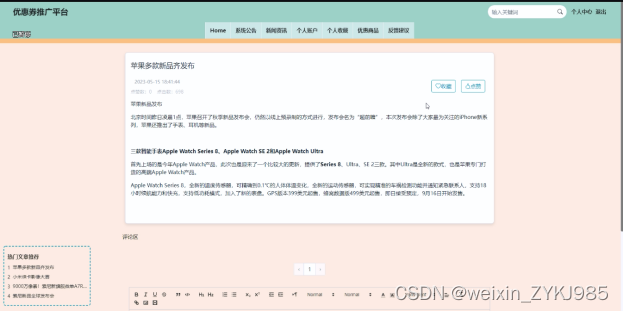 (2)新闻资讯:用户点击“新闻资讯”菜单显示所有的新闻资讯,可以按照条件进行新闻资讯的筛选或者输入关键词进行局部搜索,点击可以进入新闻资讯详细展示界面,在此界面用户可以收藏、点赞和评论。