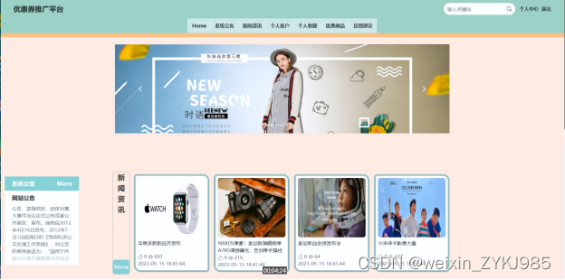 The main functional modules of the coupon promotion platform include rotation chart (rotation chart management) system announcement management (system announcement) resource management (news list, news classification) system user (administrator, customer, merchant) module management (discount products, product types, discount coupon packages, order information, feedback suggestions), adopting an object-oriented development model for software development and hardware installation, It can well meet the actual usage needs, improve the corresponding software installation and program coding work, adopt MySQL as the main storage unit for backend data, and use SSM framework, Java technology, Ajax technology for business system coding and development, achieving all the functions of the system. This report first analyzes the background, role, and significance of the research, laying the foundation for the rationality of the research work. Analyze the various requirements and technical issues of the coupon promotion platform, prove the necessity and technical feasibility of the system, and then provide a basic introduction to the technical software and design ideas required for designing the system. Finally, implement the coupon promotion platform and its departmental operation and use.
