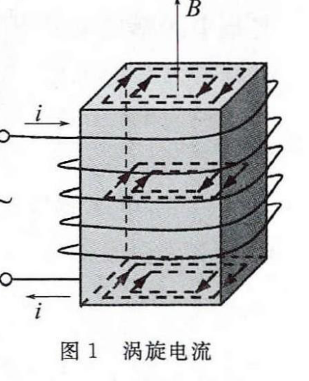 有关文献在对涡旋电流的表述中, 往往都是以变化磁场或交变磁场为前提的。一般地,处在变化磁场中的金属块,垂直磁场方向的任意一个截面都可以看成是由若干个大小不等的闭合金属环构成, 这些闭合金属环就是一个一个的闭合回路。当穿过这些闭合回路中的磁通量随变化磁场发生变化时,每个回路中都会产生涡旋状的感应电流,如图1所示。这种涡旋状的感应电流叫做涡旋电流。 [1]