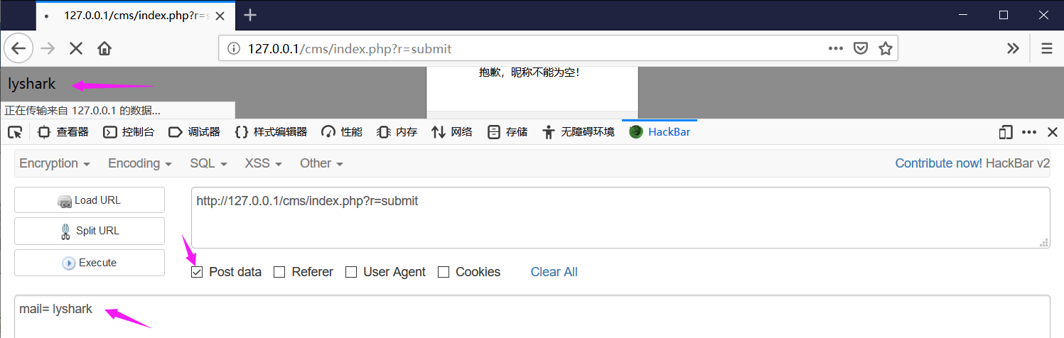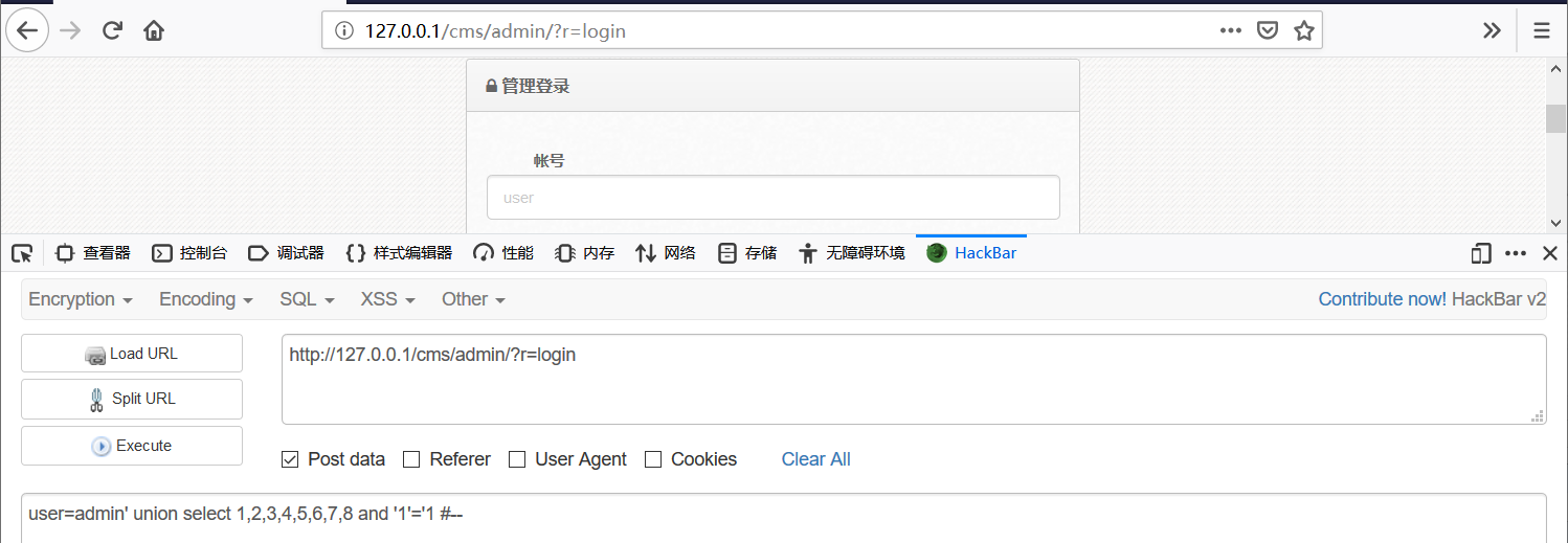 然后使用火狐浏览器的hackBar插件进行POST注入,如下图注入成功了。