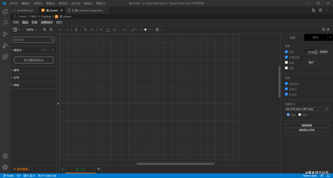 这款神器可以让我们在vscode里面快乐的画流程图。新建 .drawio 后缀文件并拖入vscode中, 即可得到如下界面????