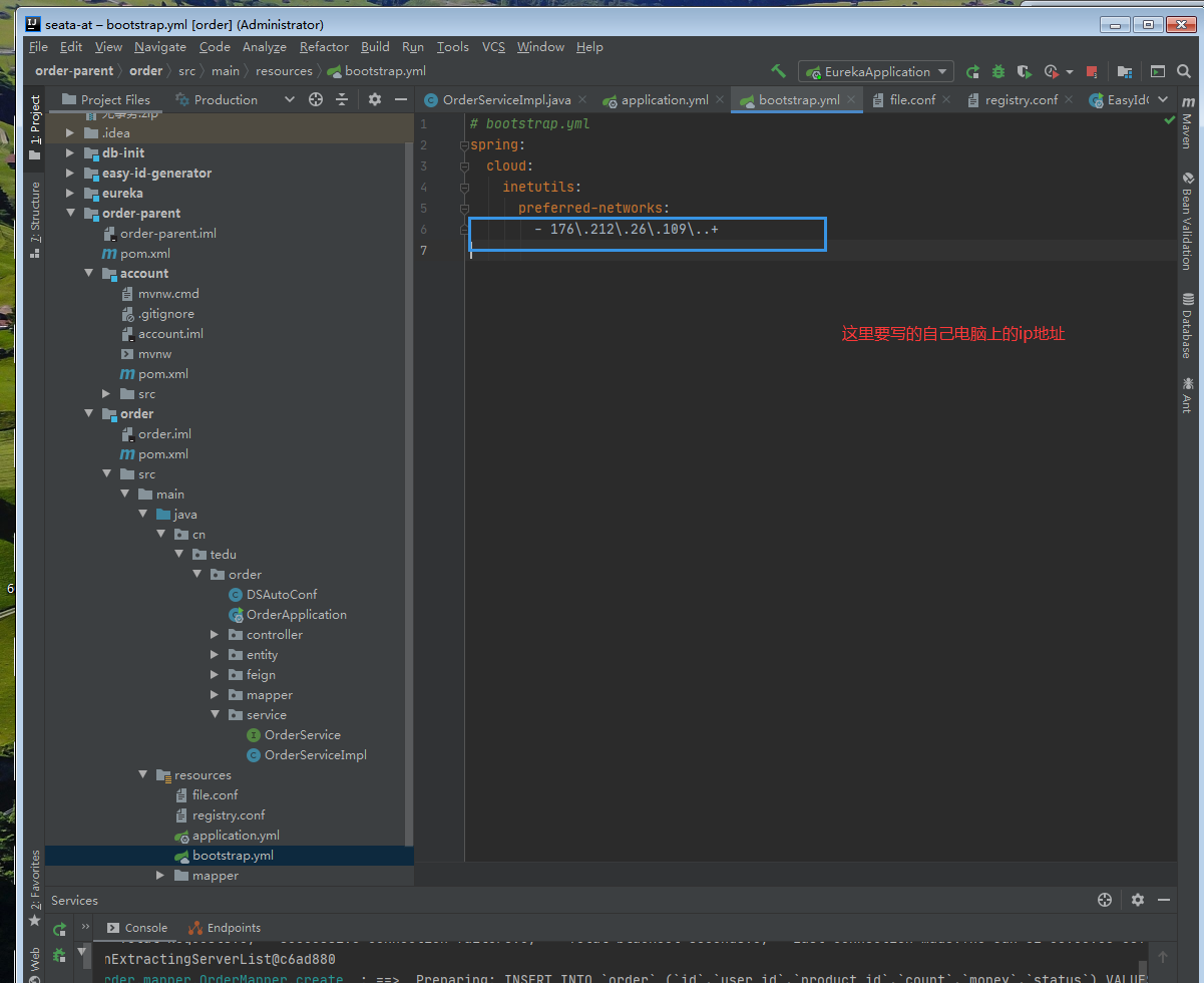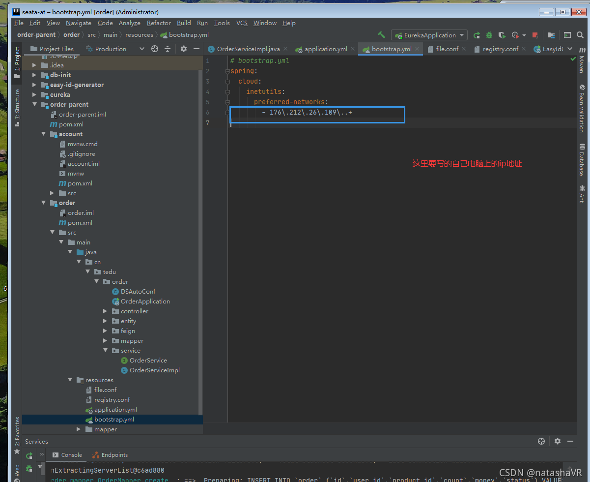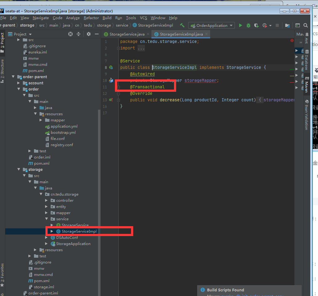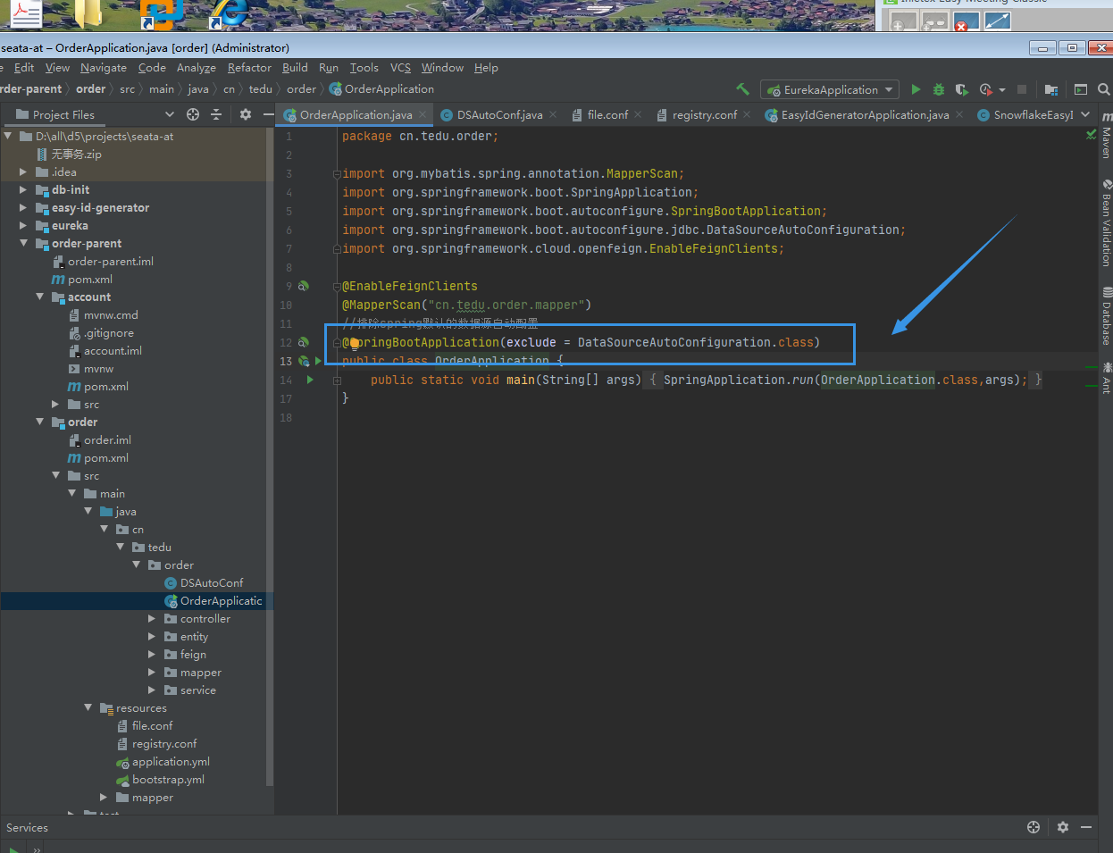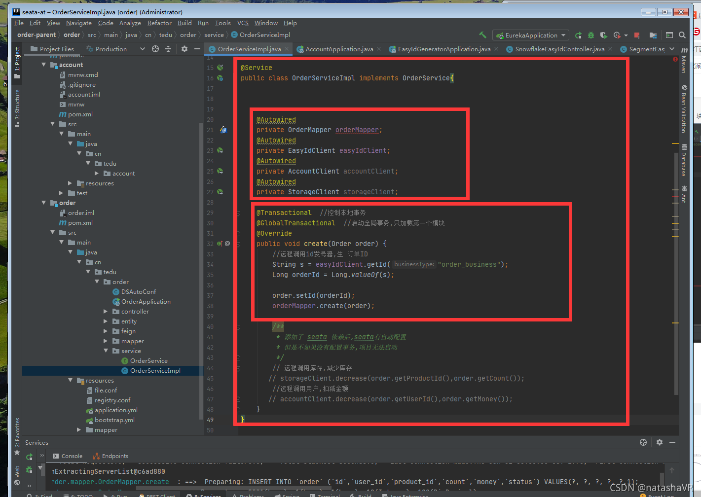 然后就是在idae中的哪个类先执行,就在哪个类里的业务方法添加事务注解:@Transactional //控制本地事务.同时加上GlobalTransactional启动全局事务.比如我们现在有一个模块,一个订单,一个用户,一个扣减金额.那个肯定是有了订单,订单分别调动用户和账户所以在订单模块里加
