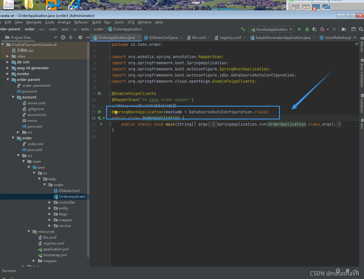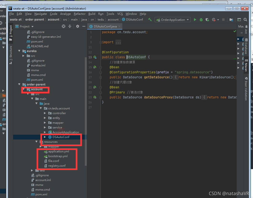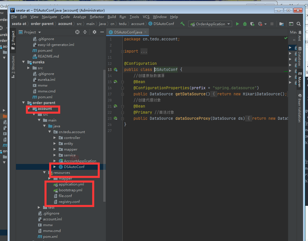 与订单项目中数据源代理完全相同,请参考订单中数据源代理章节,在 cn.tedu.account 包下创建数据源配置类 DatasourceConfiguration。主程序注解排除 DataSourceAutoConfiguration 自动配置类。.............................................................................................................................................................................................................................................................................................................................与storage里设置一样 - 重启 account 项目,并调用保存订单: