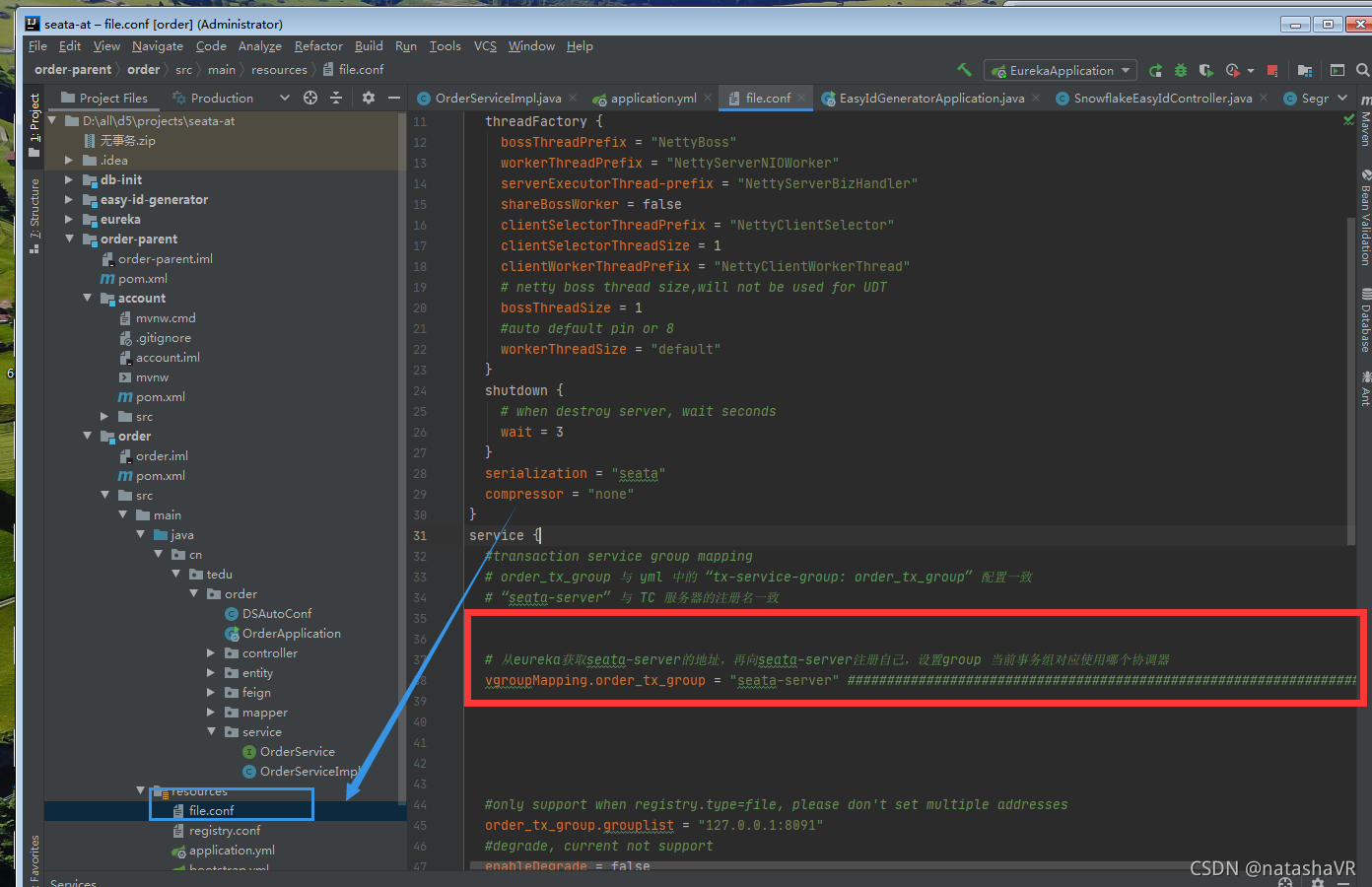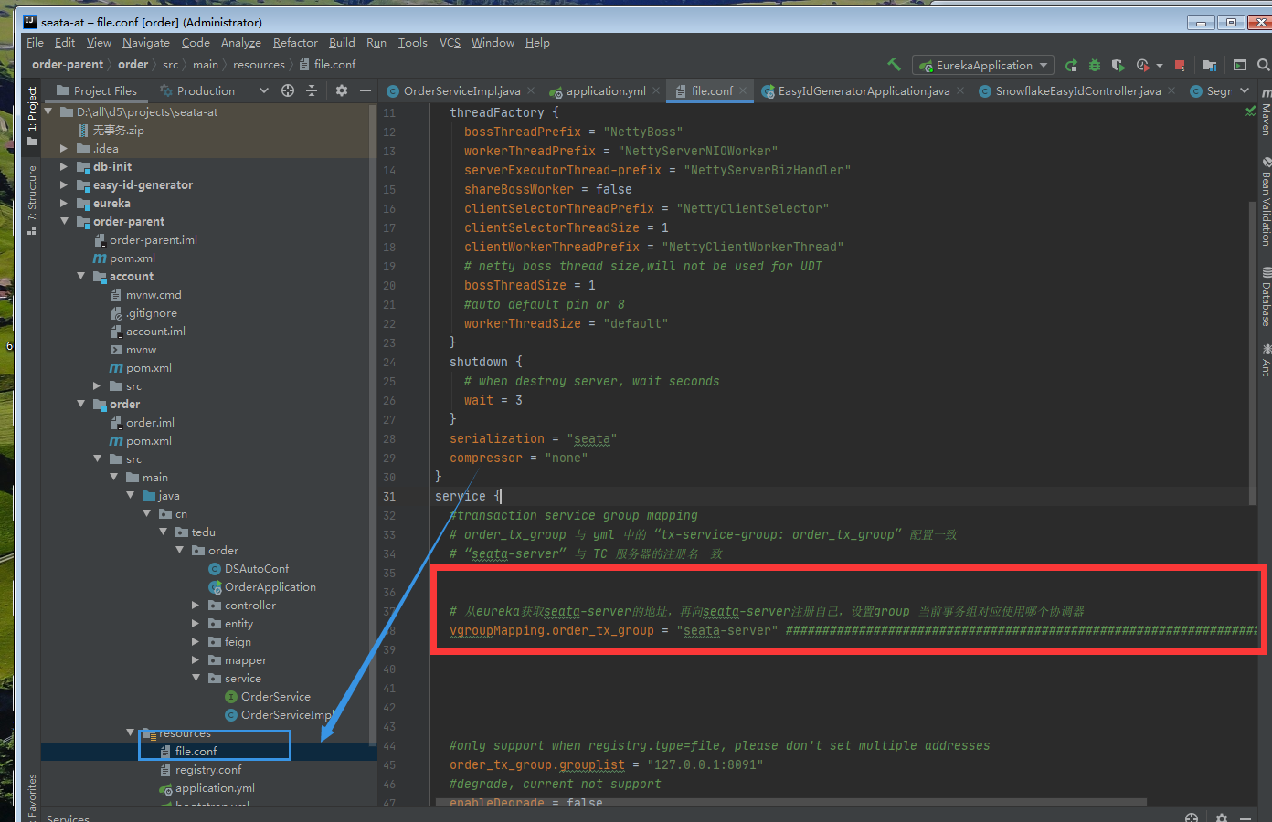订单启动全局事务部分完成,在继续之前,先把模拟异常注释掉: