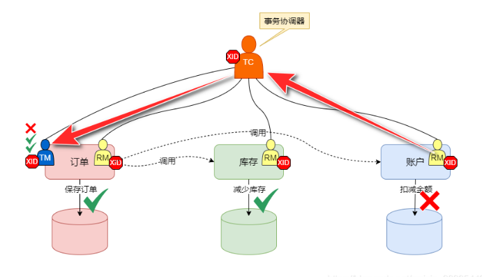 总结:确定有的订单模块都执行成功了,TC才会执行第二阶段回滚或提交,或执行失败了TC会向所有RM发送回滚操作指令,RM会完成最终回滚操作