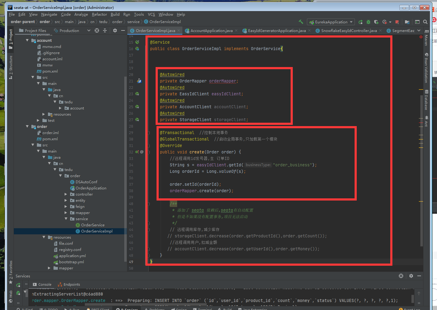 public class OrderServiceImpl implements OrderService{@Autowiredprivate OrderMapper orderMapper;@Autowiredprivate EasyIdClient easyIdClient;@Autowiredprivate AccountClient accountClient;@Autowiredprivate StorageClient storageClient;@Overridepublic void create(Order order) {//远程调用id发号器,生 订单IDString s = easyIdClient.getId("order_business");Long orderId = Long.valueOf(s);order.setId(orderId);orderMapper.create(order);//TODO: 远程调用库存,减少库存storageClient.decrease(order.getProductId(),order.getCount());//TODO: 远程调用用户,扣减金额accountClient.decrease(order.getUserId(),order.getMoney());}