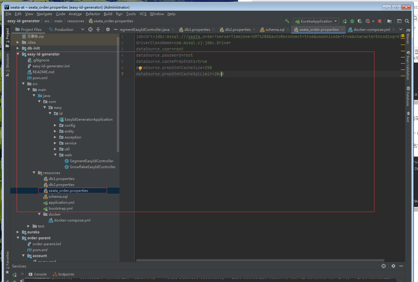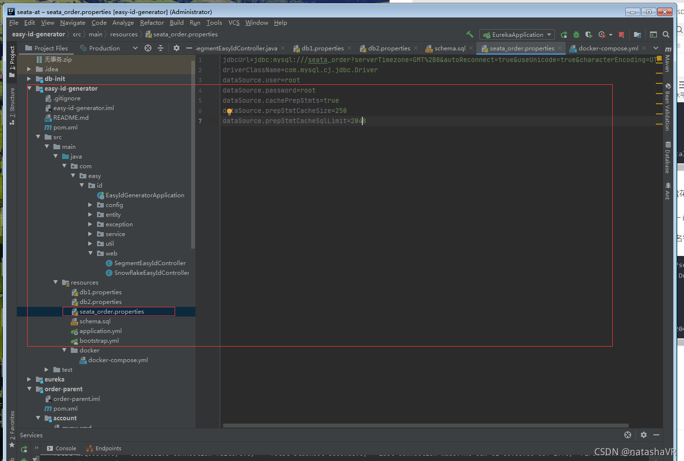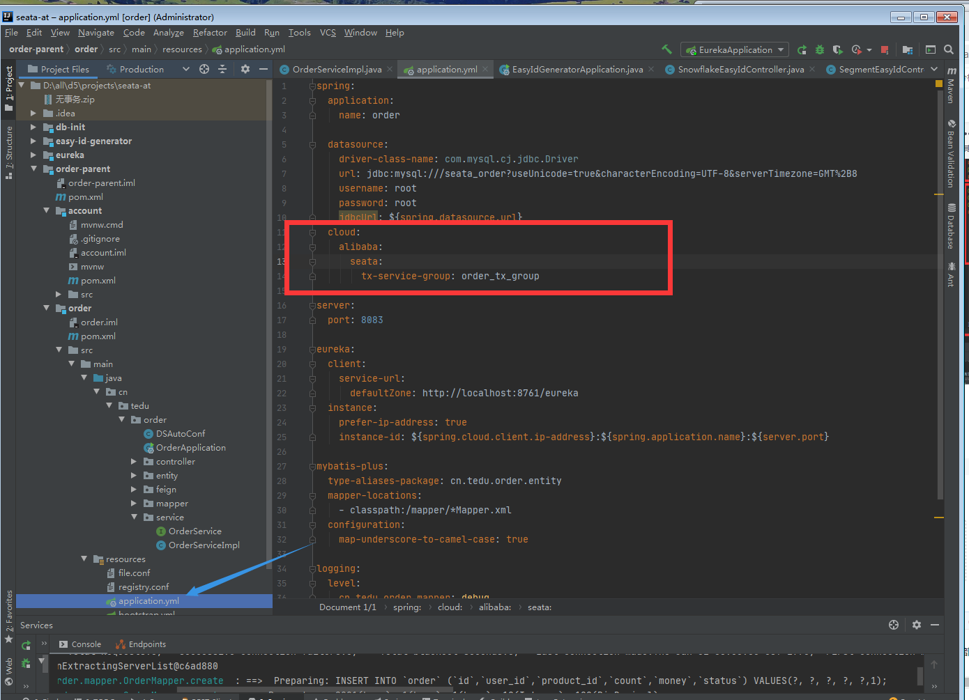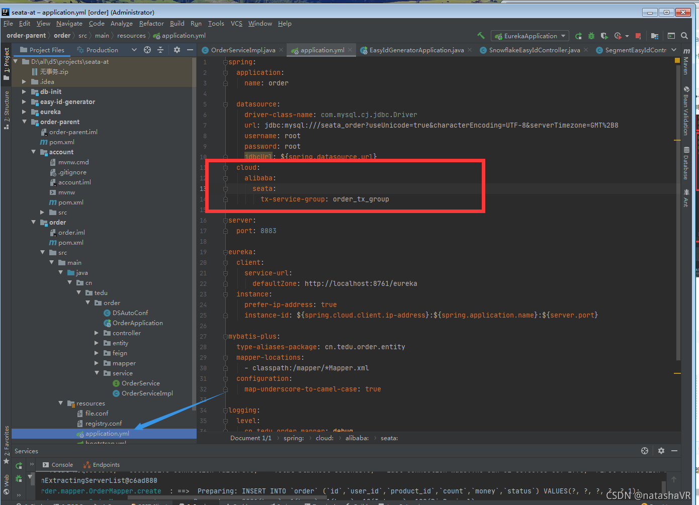 spring:application:name: orderdatasource:driver-class-name: com.mysql.cj.jdbc.Driverurl: jdbc:mysql:///seata_order?useUnicode=true&characterEncoding=UTF-8&serverTimezone=GMT%2B8username: rootpassword: rootjdbcUrl: ${spring.datasource.url}cloud:alibaba:seata:tx-service-group: order_tx_groupserver:port: 8083eureka:client:service-url:defaultZone: http://localhost:8761/eurekainstance:prefer-ip-address: trueinstance-id: ${spring.cloud.client.ip-address}:${spring.application.name}:${server.port}mybatis-plus:type-aliases-package: cn.tedu.order.entitymapper-locations:- classpath:/mapper/*Mapper.xmlconfiguration:map-underscore-to-camel-case: truelogging:level:cn.tedu.order.mapper: debug