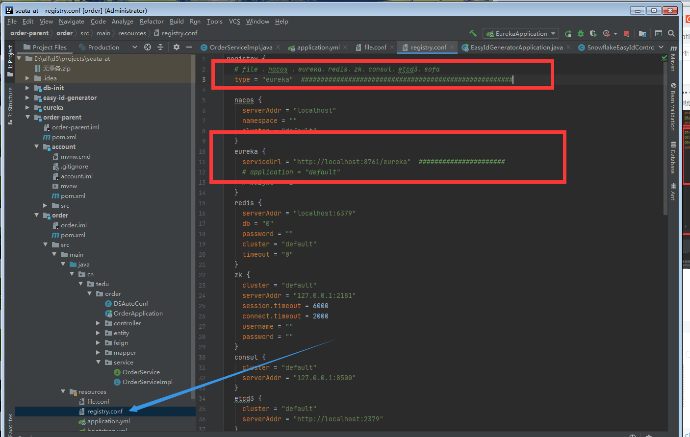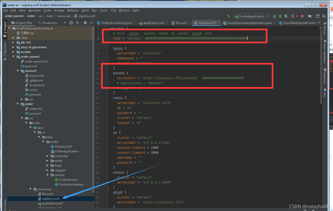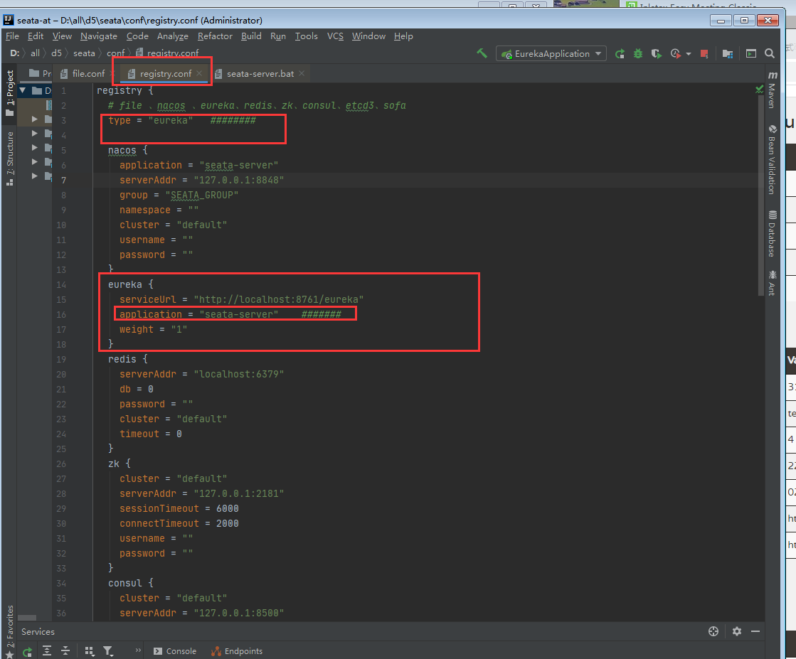 registry {# file 、nacos 、eureka、redis、zk、consul、etcd3、sofatype = "eureka" ######################################################nacos {serverAddr = "localhost"namespace = ""cluster = "default"}eureka {serviceUrl = "http://localhost:8761/eureka" ####################### application = "default"# weight = "1"}redis {serverAddr = "localhost:6379"db = "0"password = ""cluster = "default"timeout = "0"}zk {cluster = "default"serverAddr = "127.0.0.1:2181"session.timeout = 6000connect.timeout = 2000username = ""password = ""}consul {cluster = "default"serverAddr = "127.0.0.1:8500"}etcd3 {cluster = "default"serverAddr = "http://localhost:2379"}sofa {serverAddr = "127.0.0.1:9603"application = "default"region = "DEFAULT_ZONE"datacenter = "DefaultDataCenter"cluster = "default"group = "SEATA_GROUP"addressWaitTime = "3000"}file {name = "file.conf"}