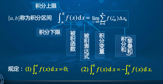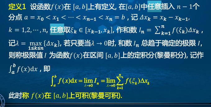 7. 函数可积(黎曼可积)的定义(基本概念:积分区间、积分上限、积分下限、被积函数、被积表达式、积分变量、积分和(黎曼和))