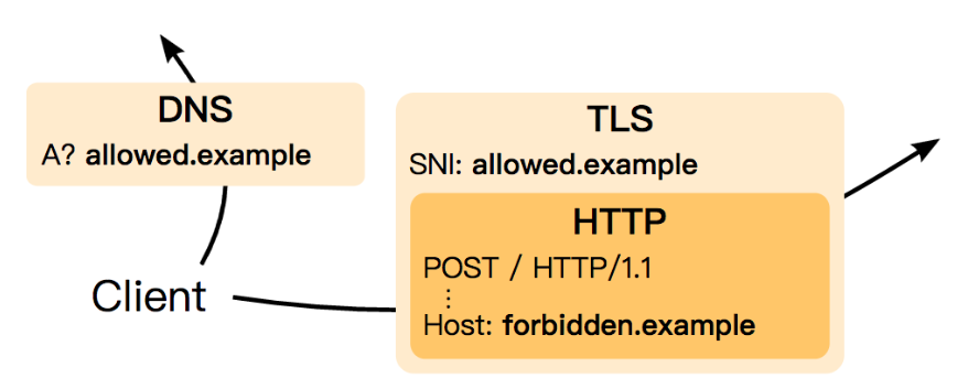 最近看到了一些关于Domain Fronting的技术,感觉很有意思,其特点在于,你真正访问的域名并不是你看到的域名,即可以隐藏攻击者的真实地址,并且此技术能够让我们在一些受限制的网络中依然连接到我们的C2服务器,其关键思想是在不同的通信层使用不同的域名,在HTTP(S)请求中,目标域名通常显示在三个关键位置:DNS查询,TLS(SNI)拓展及HTTP主机头中,通常,这三个地方都会是我们要访问的域名地址,然而,在”Domain Fronting”请求中,DNS查询以及SNI携带了一个域名(前域),而在HTTP host头中携带了另一个域名(隐蔽的,被禁止访问的域名),简单的图例如下: