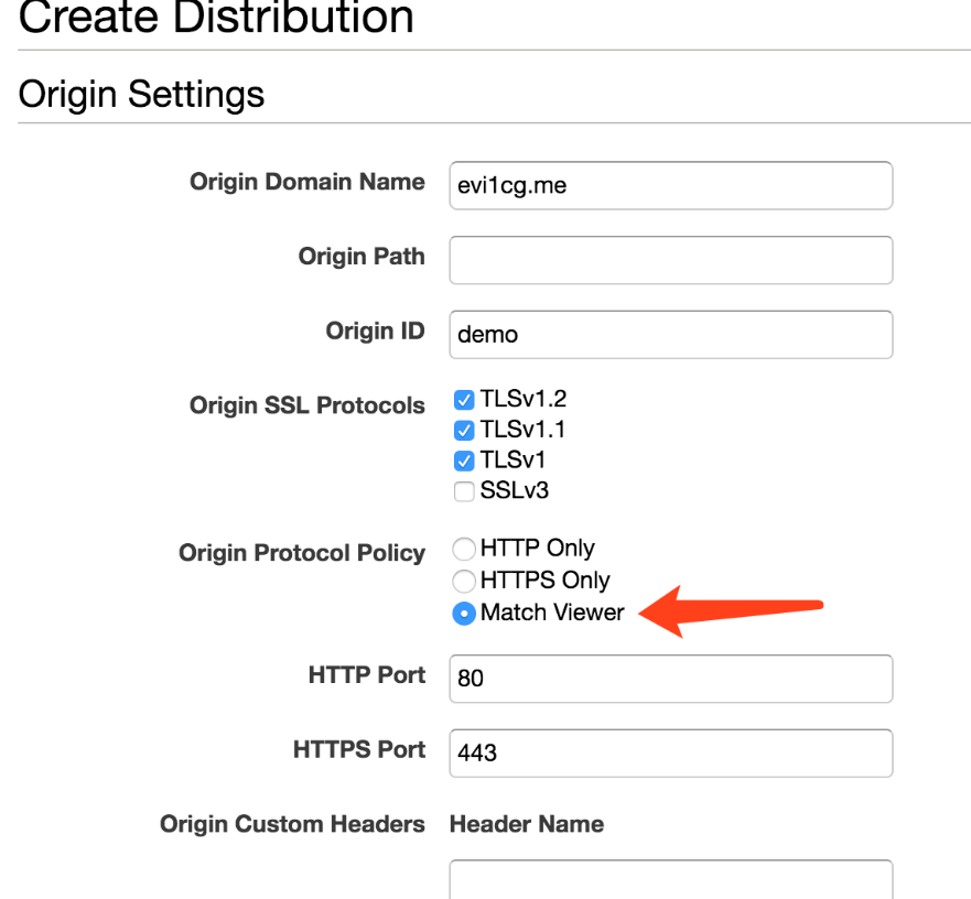 填入自己的域名,并把Origin Protocol Policy配置为Match Viewer