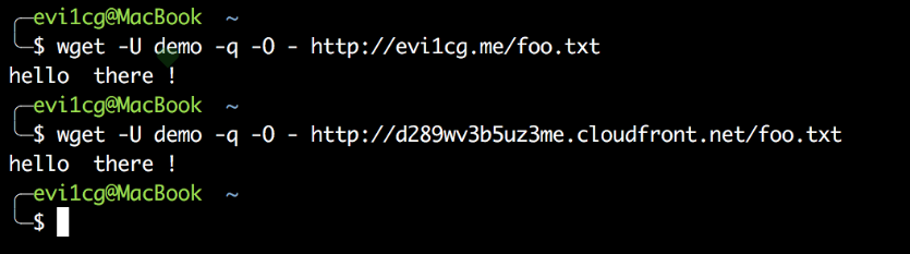 wget -U demo -q -O - http://d289wv3b5uz3me.cloudfront.net/foo.txt hello there !