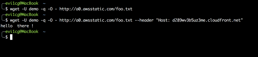 wget -U demo -q -O - http://a0.awsstatic.com/foo.txt --header "Host: d289wv3b5uz3me.cloudfront.net"