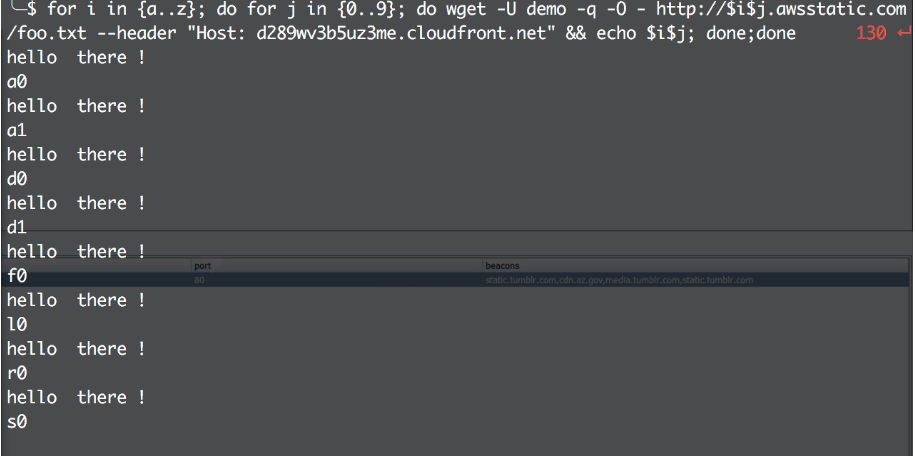 for i in {a..z}; do for j in {0..9}; do wget -U demo -q -O - http://$i$j.awsstatic.com/foo.txt --header "Host: d289wv3b5uz3me.cloudfront.net" && echo $i$j; done;done