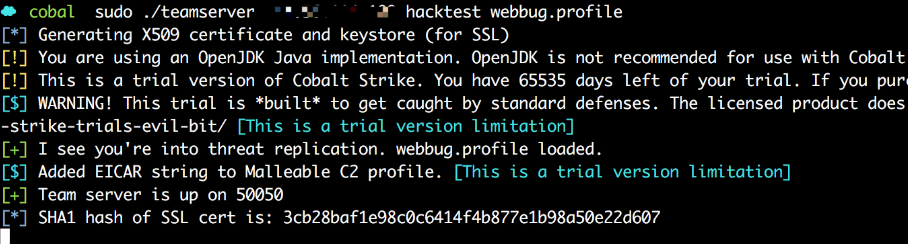 cobal sudo ./teamserver [your ip] hacktest webbug.profile